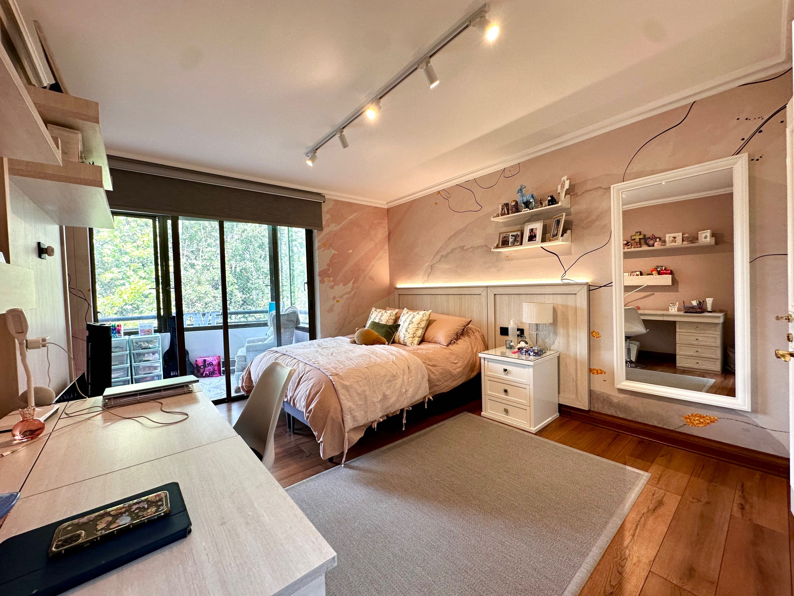 Excelente y amplio departamento en TERCER piso con gran terraza y vista despejada a los jardines. Ubicado en residencial sector de San Damian. Buena conectividad y accesos a Avenida Las Condes, San Damian y Camino Fco de Asis. Detalles: 5 Dormitorios (2 en suites), dormitorio principal con 2 walking closet, 4 baños + 2 servicios completos Cocina remodelada, equipada con lavavajilla, horno eléctrico, microondas encimera, campana con extractor, despensa, todo empotrado, con logia independiente. Domótica en iluminación, El departamento cuenta con amplio hall de acceso, amplios espacios con living y comedor separado con salida a gran terraza con vista a increíble jardín. Amplia cocina con logia separada. Exclusivo condominio, espacios verdes,, piscina, juegos de niños y gimnasio. Seguridad 24/7. 3 estacionamientos y amplia bodega. 3 terrazas (living comedor, dormitorio principal